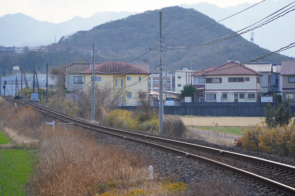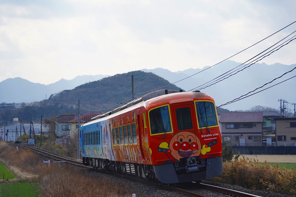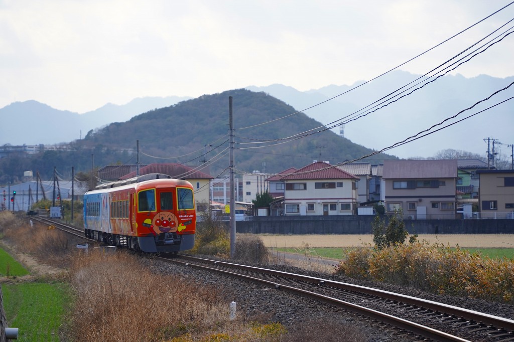 その後実家、幼馴染を訪ねる合間に造田駅に入線するアンパンマン仕様の「特急うずしお」を撮影に行きます。場所は造田駅から志度側に行った鴨部川の橋梁近くのストレートです。田んぼに水が入ったりすると、田園の中を走る列車を撮影できるのですが何分冬枯れ+雑草で志度側に向かっては撮影がしづらい感じです。