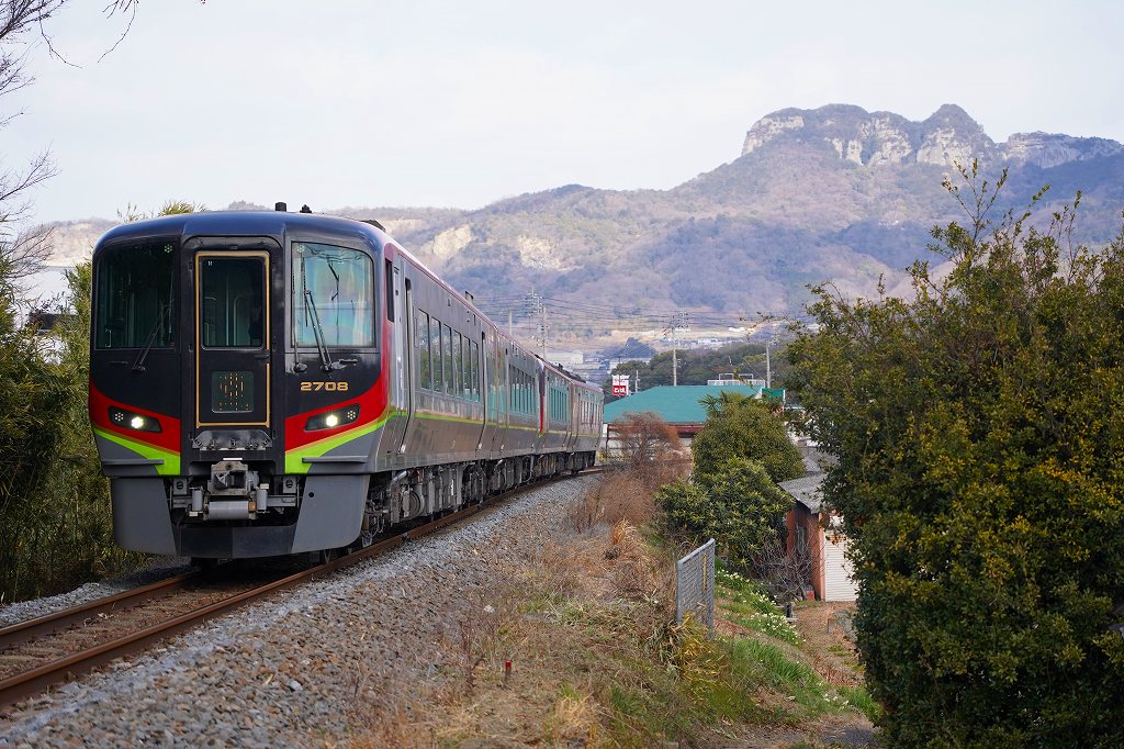 撮影場所についてファインダーをのぞくやいなやで、あっというまに特急うずしおがやってきます。上りの列車は朝は逆光ですが、昼からは順光で先頭車両も明るく撮影できます。