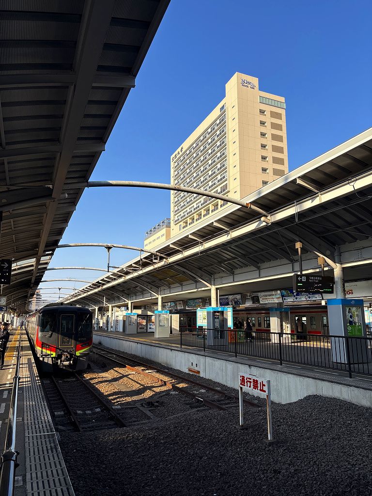 e5489で予約した切符を発券し、改札を抜けていきます。9:04の発車まで時間があるのでホームをうろつきながら写真を撮ったり、コンビニでサンドイッチとコーヒーを購入します。