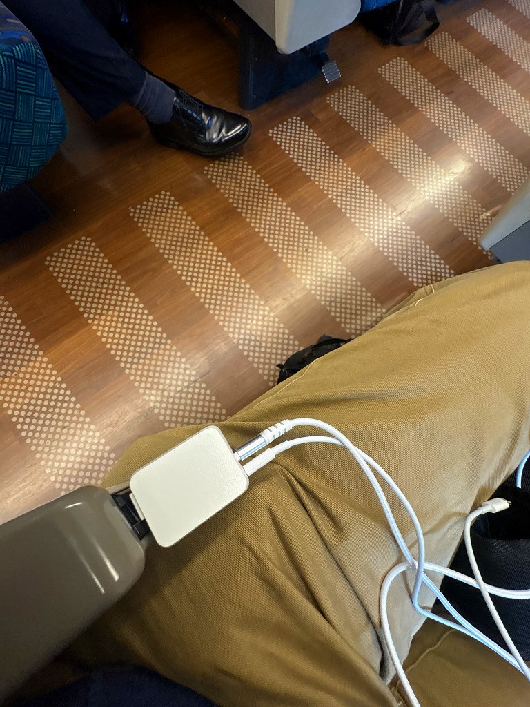 外も見れないので、この時点でも九州旅行を諦めていませんでしたのでe5489で調べまくっていたらバッテリーが切れそうになります。安心してください、最新車両なのでコンセントがついていますよ。安心、安心。