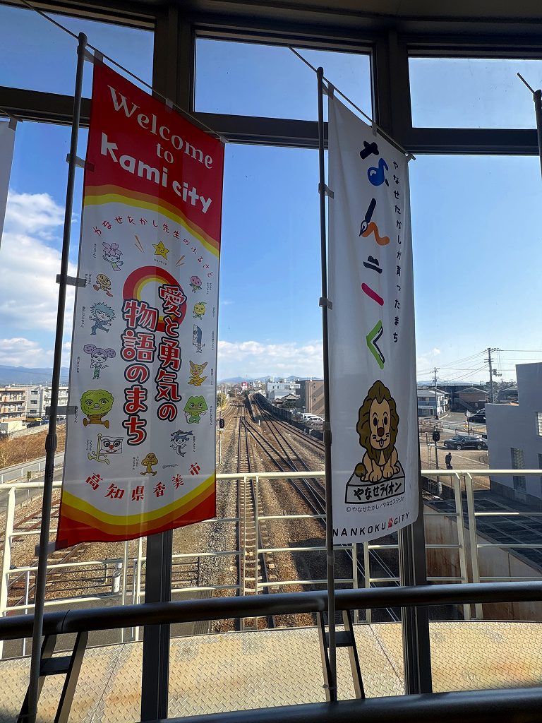 移動手段として乗っているかたがほとんどの様で、右も左もシェードが降りており車窓が見えません。ここから、坪尻駅、大歩危・小歩危と土讃線の見どころなのにもったいない。阿波池田あたりは樹氷のように山に雪が降っており、雲が棚引いて幻想的なのがチラリと見れますが横のおじさんもずっとスマホゲームをしています。大歩危あたりで観光客と思しき中国系の人たちが降りて行きます。早速、アンパンマン列車をバックに写真を撮っています。中国の人はアンパンマンを知っているのか、と思いつつぼんやりしていると大田口駅通過。義母の家の辺りは雪は降っていないようです。