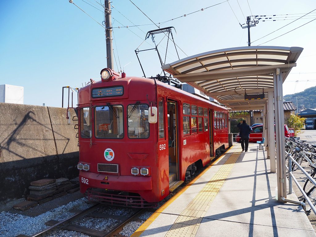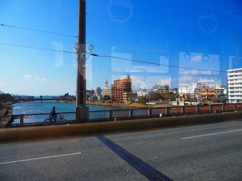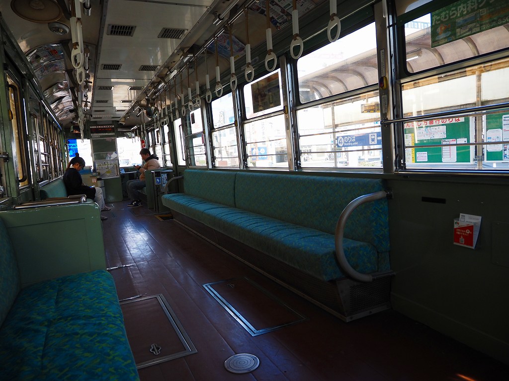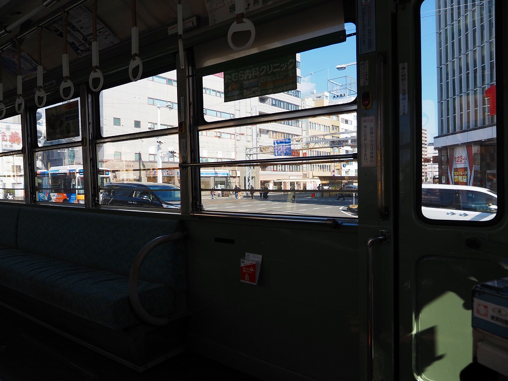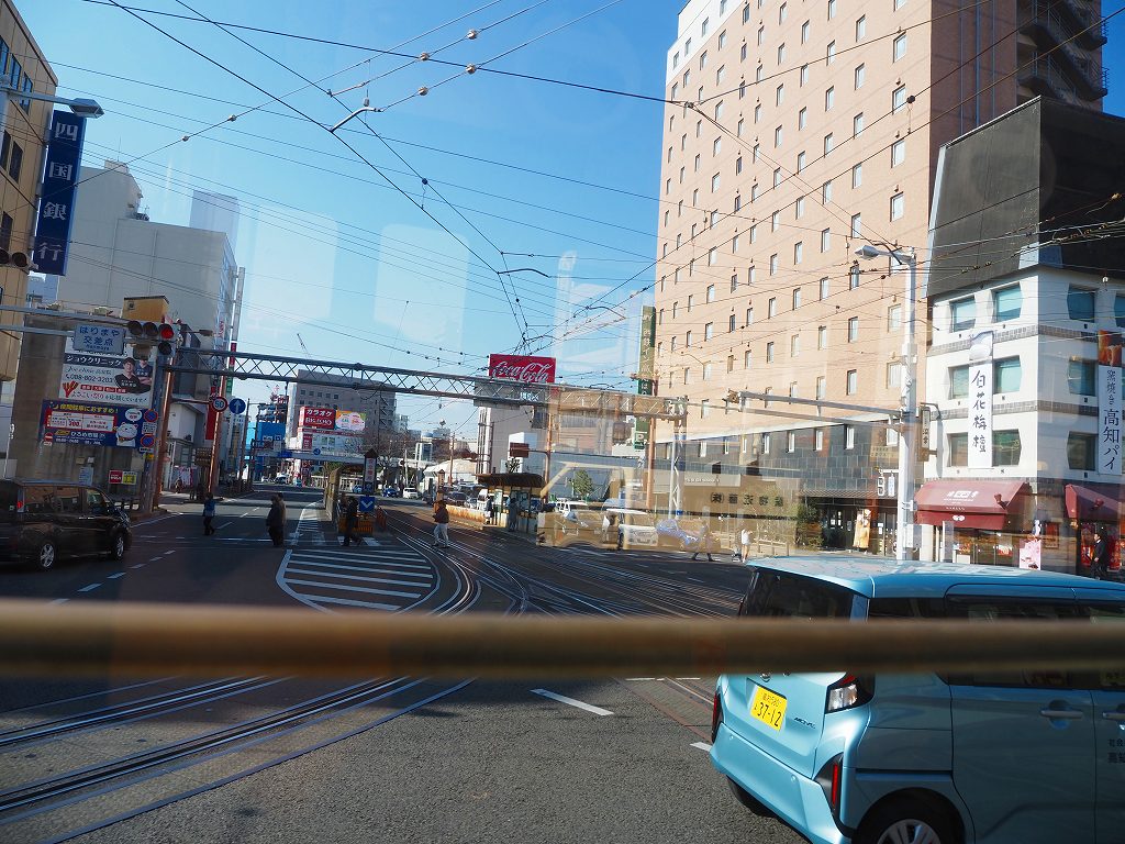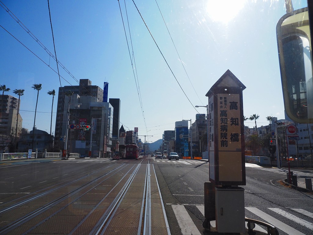 始発からは5人程度の乗車です。天気もよくポカポカします。また、車では何度も走った道ですが電車からの風景はまた格別です。来てよかったと思いつつ電車ははりまや橋を目指します。やはり、高齢の方や意外にも松葉杖をついた通院んと思しき人が数人いました。どこかの電停横に高名な整形外科でもあるのでしょうか。
