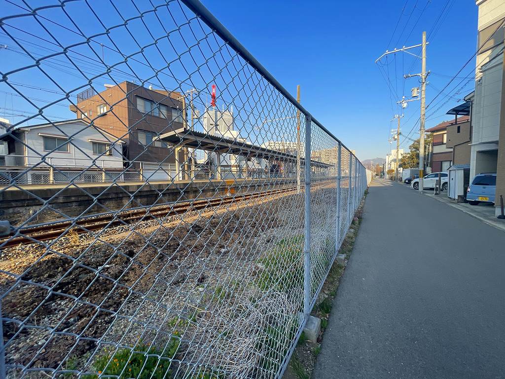 駅舎がなく、ホームの横のフェンスに出口があり改札を通ることなく駅を後にしています。