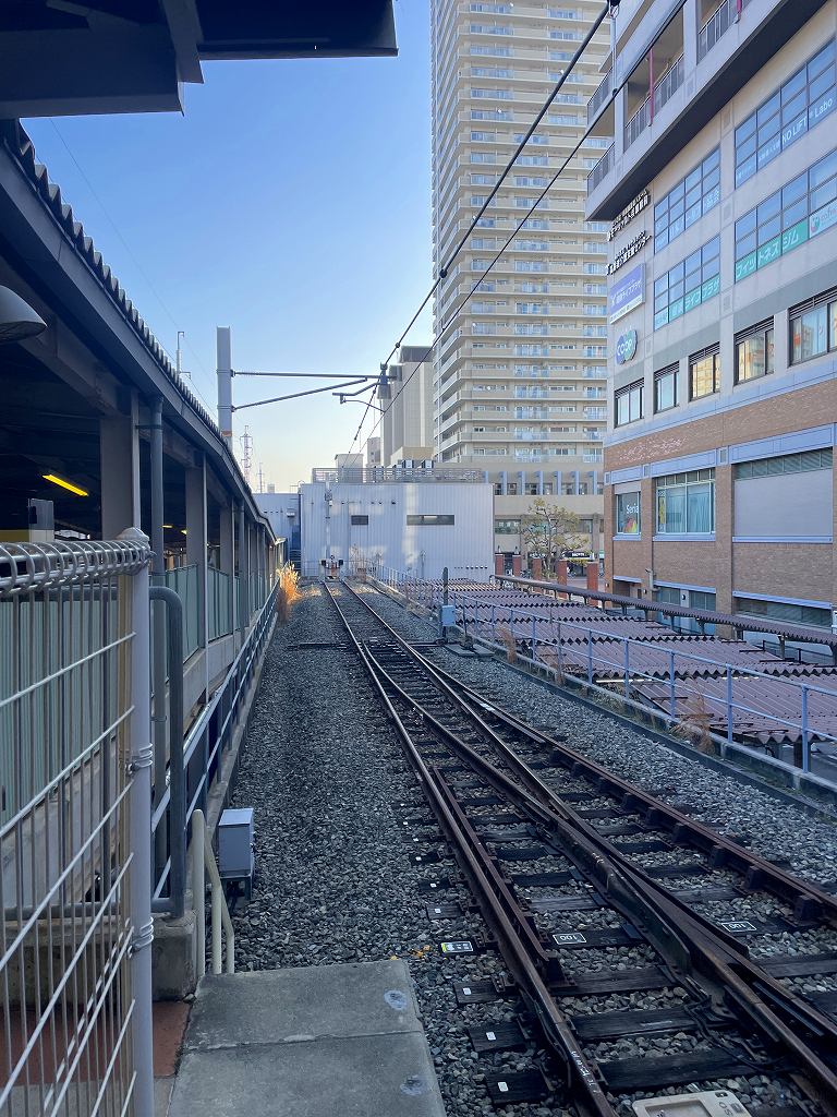 終点の車止めの後ろから撮影します。