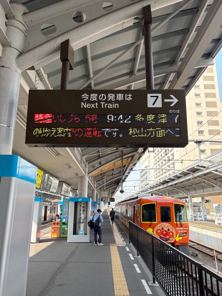 いつも特急で行きますので、今回は高速バスで行くこととします。まあまあゆっくり家を出て、12時過ぎには松山市駅に到着、そこから伊予鉄に乗る段取りです。妻に高松駅まで送って欲しかったのですが仕事なので、高徳線で高松駅を目指します。