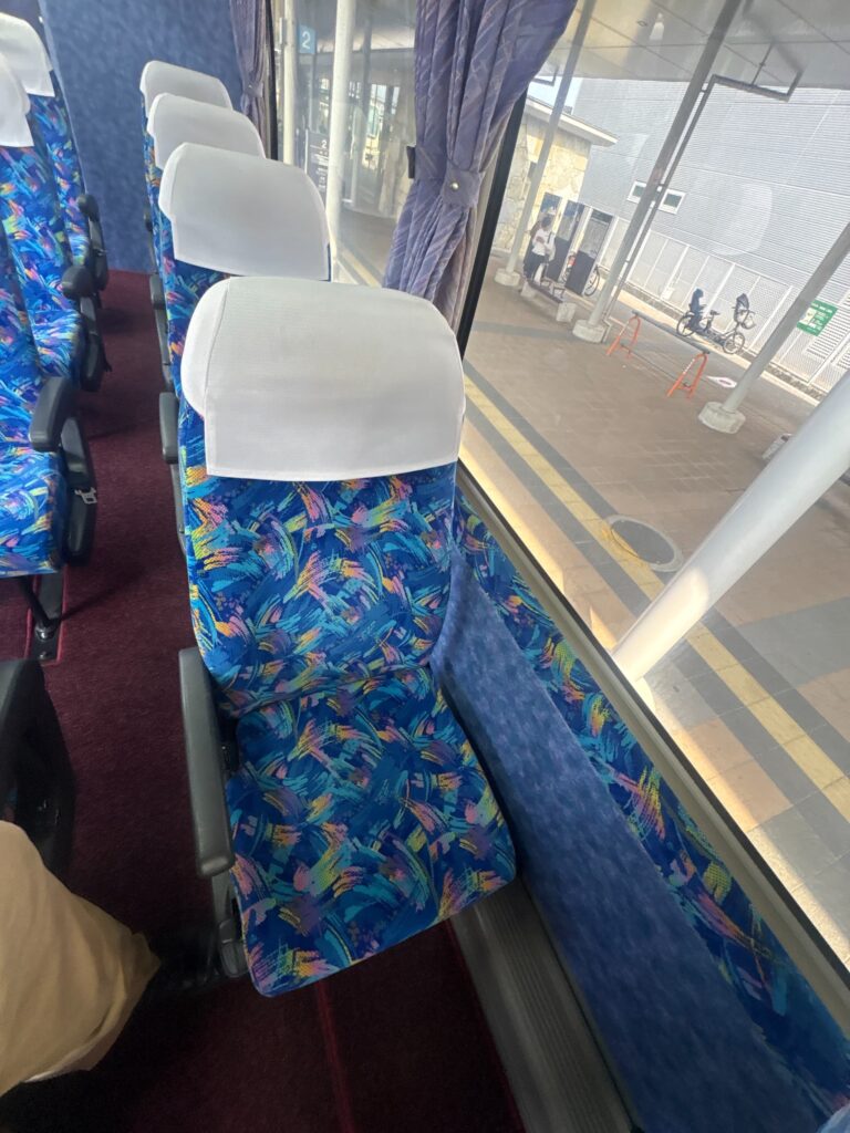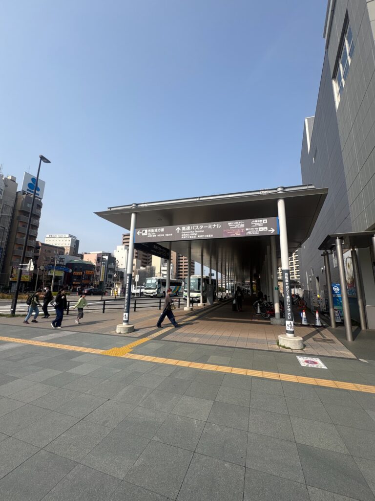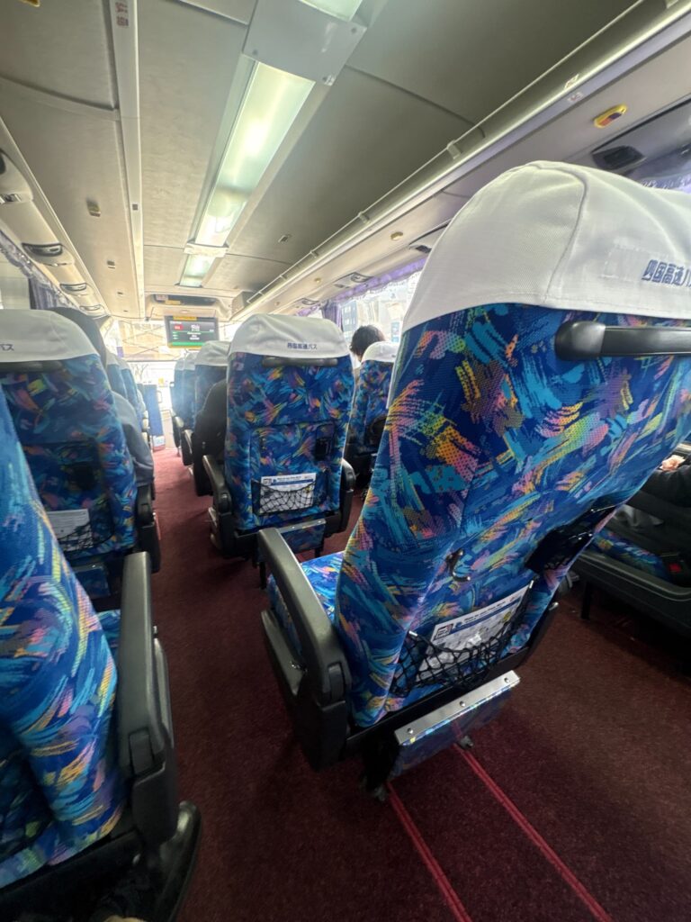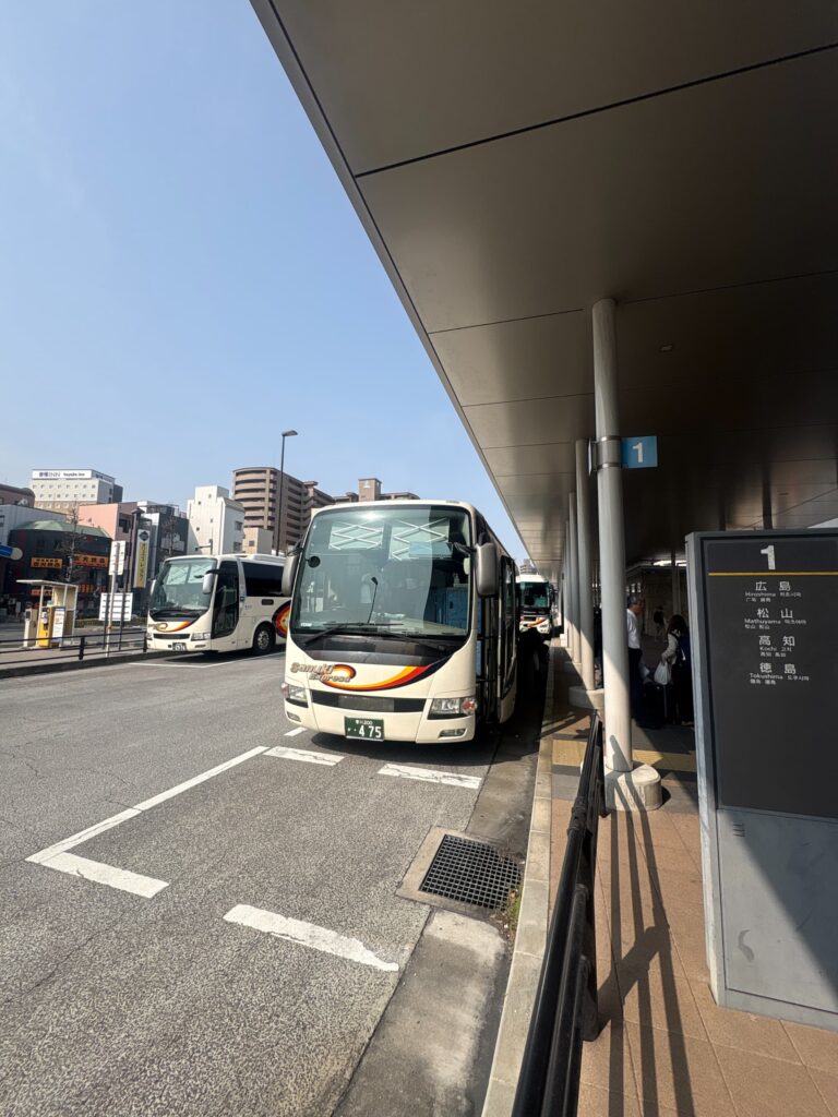 駅の南側に高速バスターミナルがあります。京都、三宮、難波など関西方面には大きなキャリーバックを持った老若男女が乗り込んでいます。当方が乗る松山行きは出発予定10分前だというのにやってきません。一抹の不安を抱えながら待っていると、5分前に到着で切符の改札がはじまります。