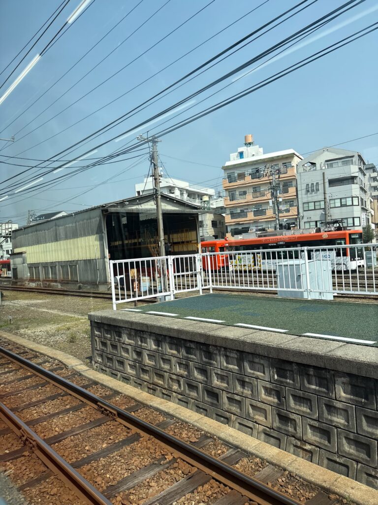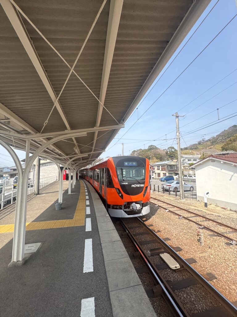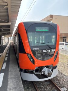 今回は従来の車輛です。松山市から伊予市のほうへ、こちらの路線のほうが松山市の中心部を通っていくようです。このまま折り返そうかと思っていたのですが、伊予市駅からJRに乗り換えして特急宇和海に4分程度で接続可能です。