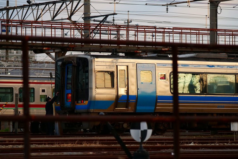 衣笠池の向こうから太陽が昇ります。まあ、乗り鉄から予定変更はあったけどまあまあ楽しかったなあと思いつつ帰路につきます。モーニングうどんを食べようと思いながら高松市中心部に向かいます。途中、西宝町あたりでJR四国の車庫が目につきます。先ほど撮影できなかった2000系が回送で車庫に来ており、ちょっと見ていくこととします。