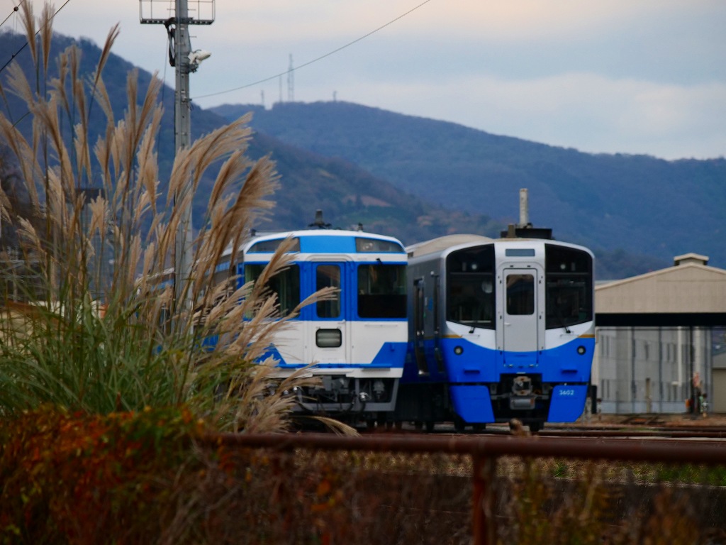 キハ185の間から新型車両の3600形がチラッと見えます。