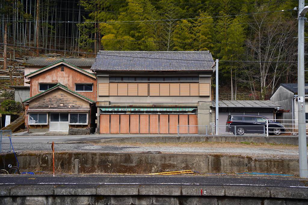 この奥に見える緑の屋根が喫茶店です。おそらくこの店で火野正平さんが焼うどんを食べたのではないでしょうか?今は寂れていますが、木材の集積地として往時は映画館もこの近くにあったそうです。おじいさんが大きな鼻歌を歌いながらお店から出てきて、白い軽四を吹かしながら走っていきました。ミッション車のようで、クラッチをつなぐときにずいぶん吹かしているようでした。