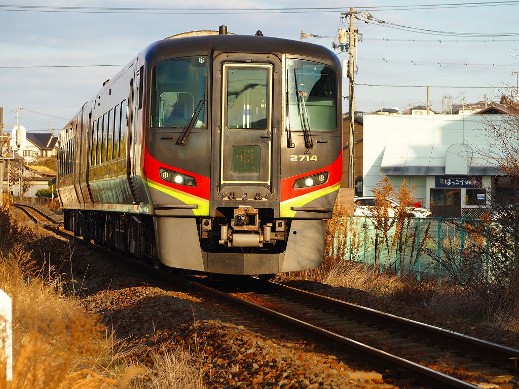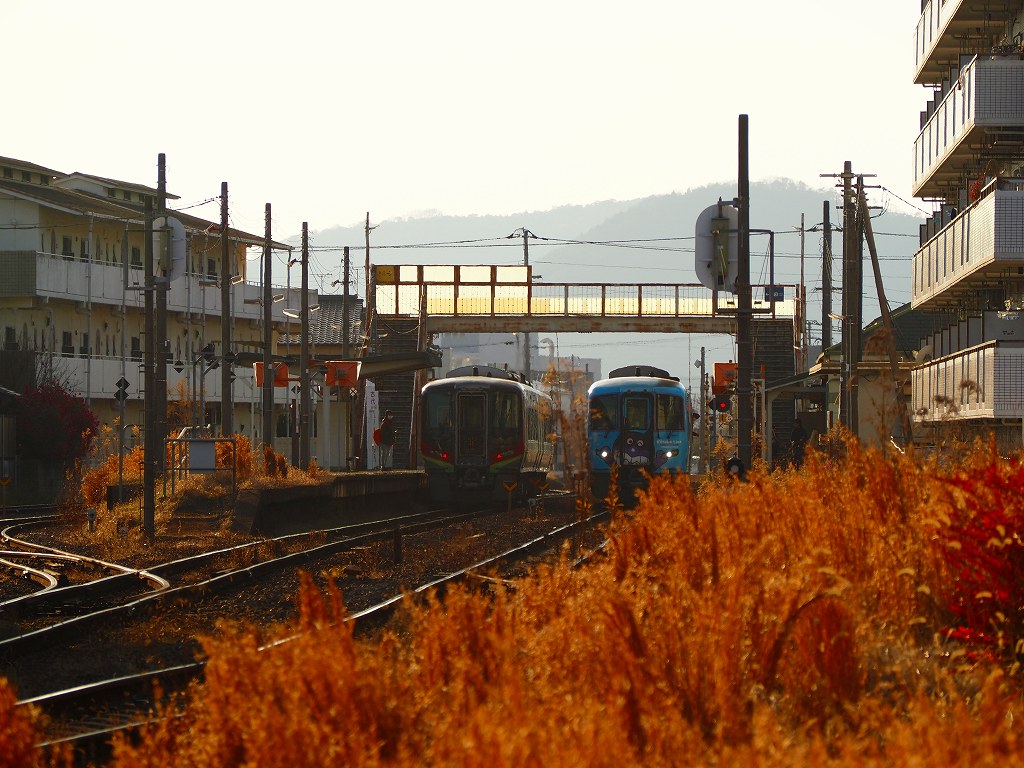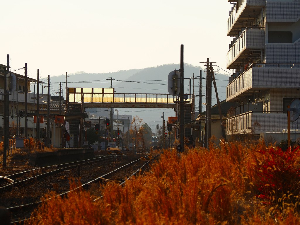いつも通り屋島駅東側の踏切から撮影です。線路の南側から撮影を試みますが、枯れ草があってうまく撮れません。北側に移って撮影をします。