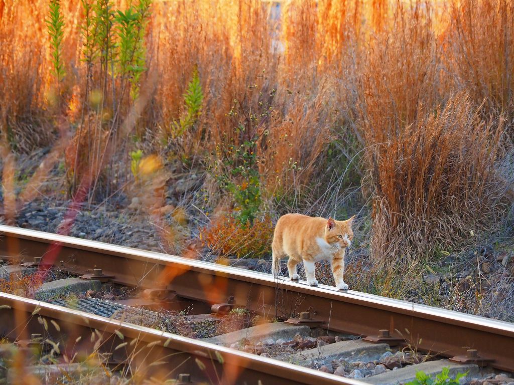 再度アイコンタクトをしばし行います。そうすると踏切から警報音が鳴って、ニャンコは走り去ります。
