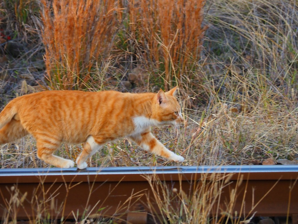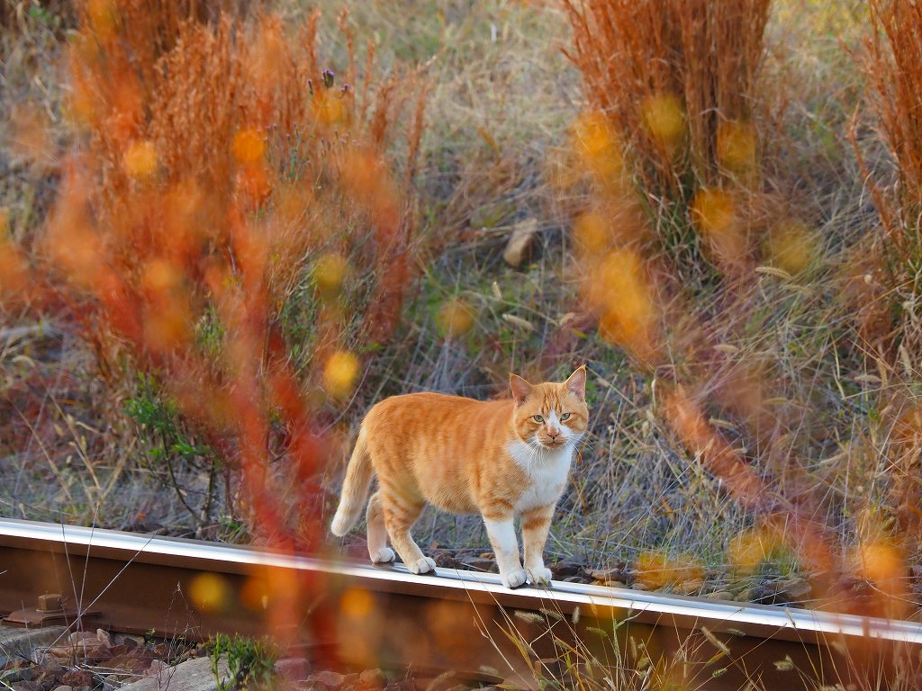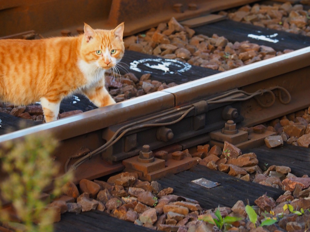 いつもは踏切の北側から撮影することが多いのですが、レンズがそれほど長い望遠では無かったので南側から撮影をします。列車を待っていると、ニャンコがやってきます。