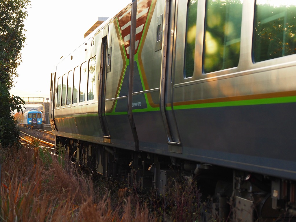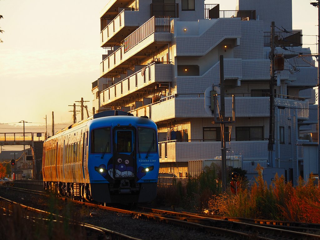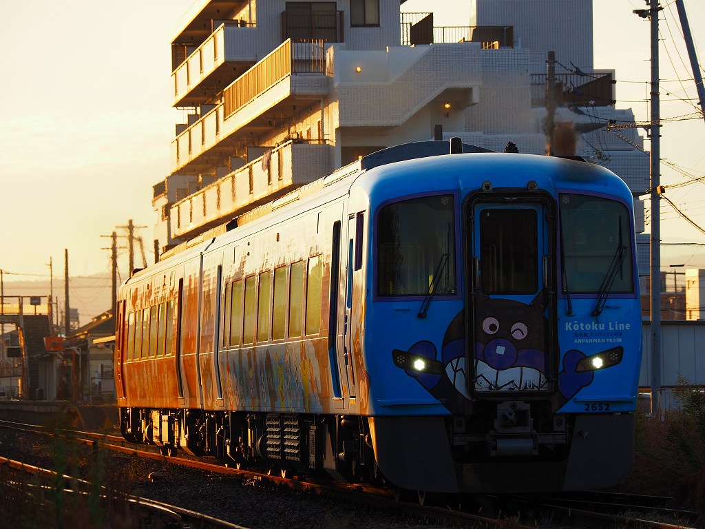 11月の週末、4時過ぎの「特急うずしお」を撮影に屋島駅付近に行って参りました。なんだか曇天の週末が多かったのですが、この日は夕焼けです。夕陽を浴びて走るアンパンマン列車を撮影しようという考えです。