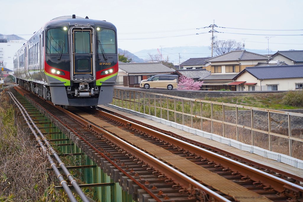 ここからは、満腹でふうふう言いながら東を目指します。O君が湊川河津桜ロードに行こうというので、とりあえずは湊川橋梁で撮影したり、ロードを歩いたりしながら六車うどんのリベンジをしようという計画です。