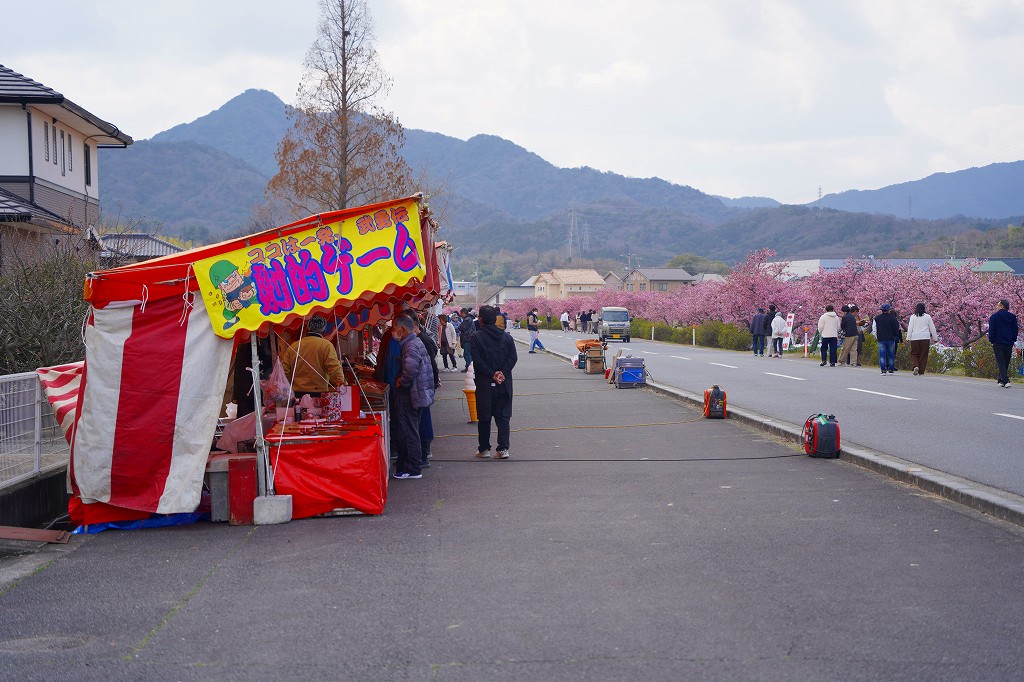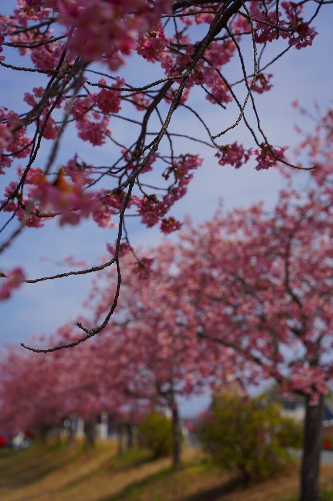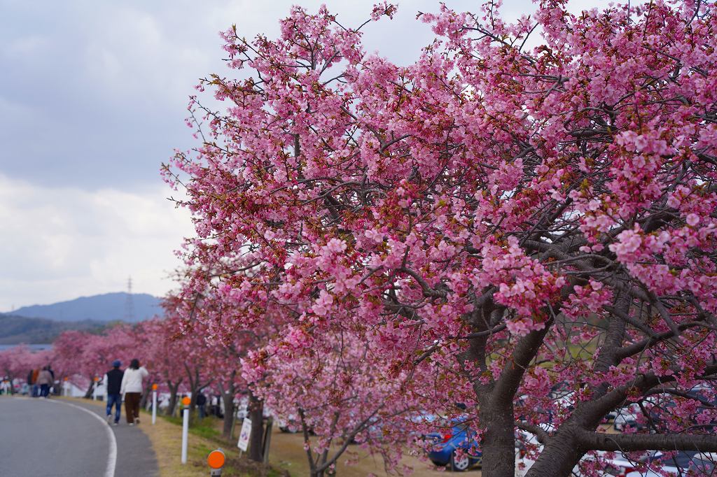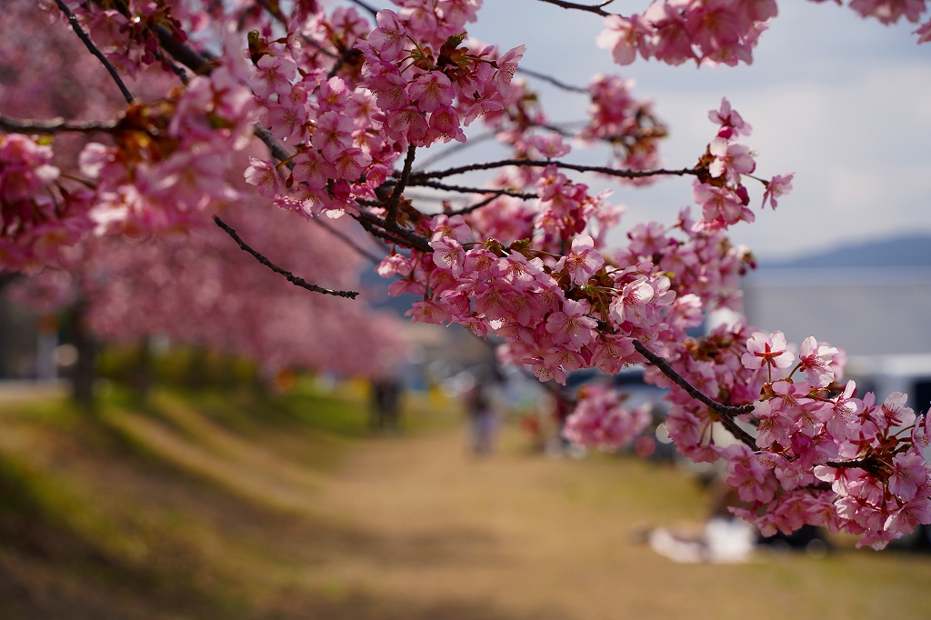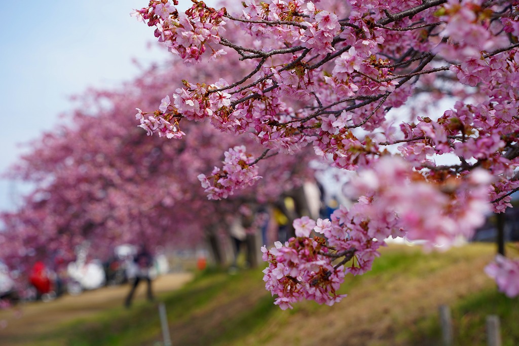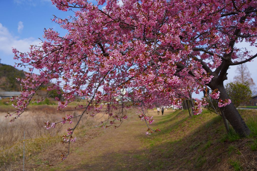 この場所から1キロ弱程度川上に上ると、堤防沿いに河津桜が咲いていてわんさかと花見客がいます。花見と言っても宴会ではなく、堤防沿いを花を見ながら皆さん歩いています。