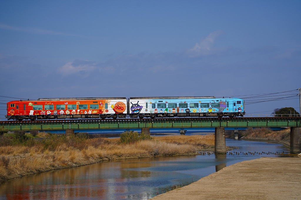 対岸にも撮影されている方がおり、アンパンマン列車が沿線住民の注目を浴びていることは間違いありません。