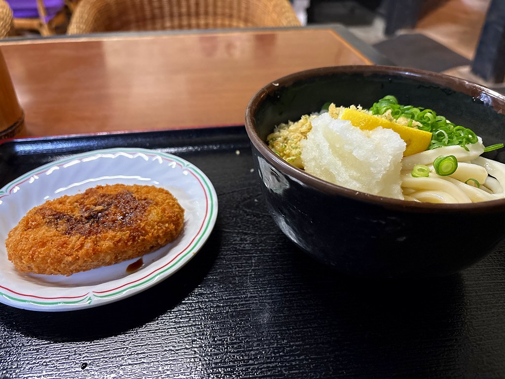 ぶっかけ小+コロッケを食べます。