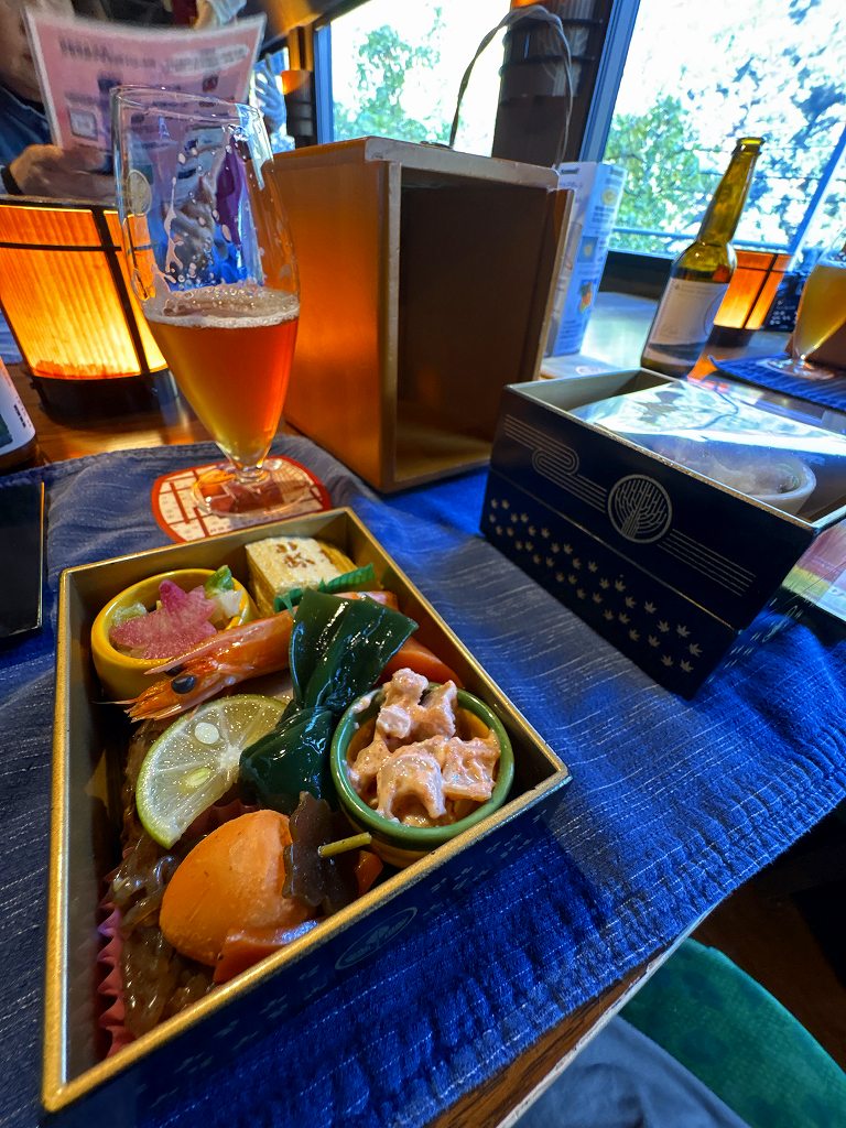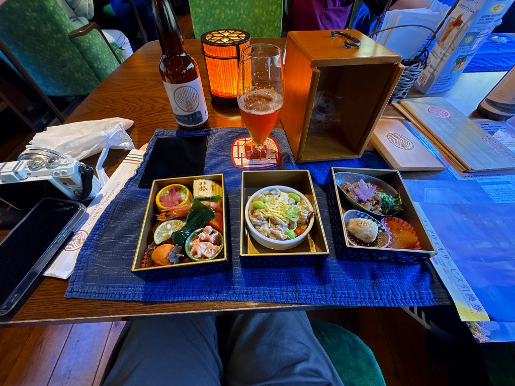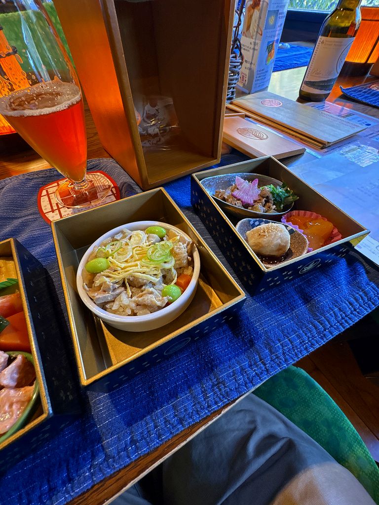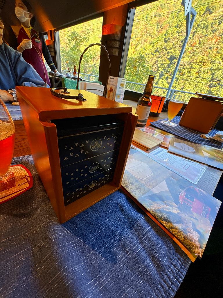 味匠 藤本の三段重です。このような箱で出てくるのが、阿波スタイルですというような説明がアテンダントからあったような気がします。もう、すでに酔いどれの状態なので記憶が定かではありません。