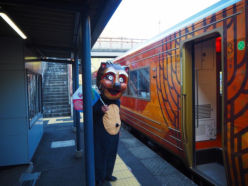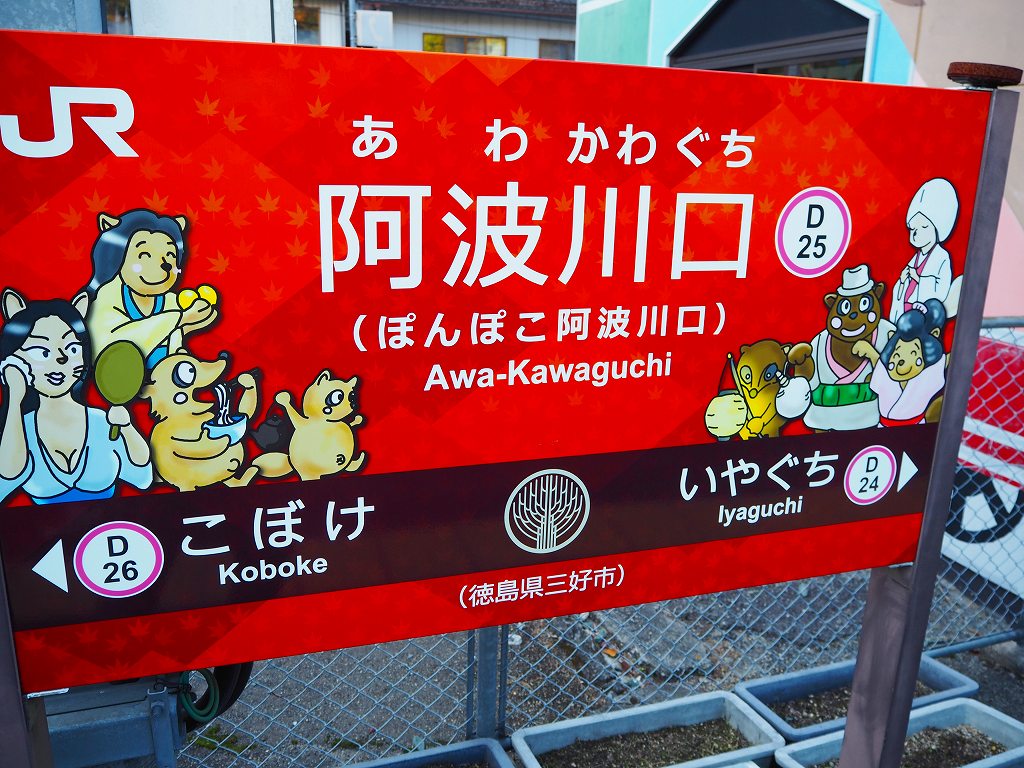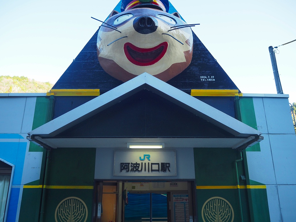 阿波川口駅で停車します。気がつきませんでしたが、左の狸のお姉さんが妙にセクシーです。