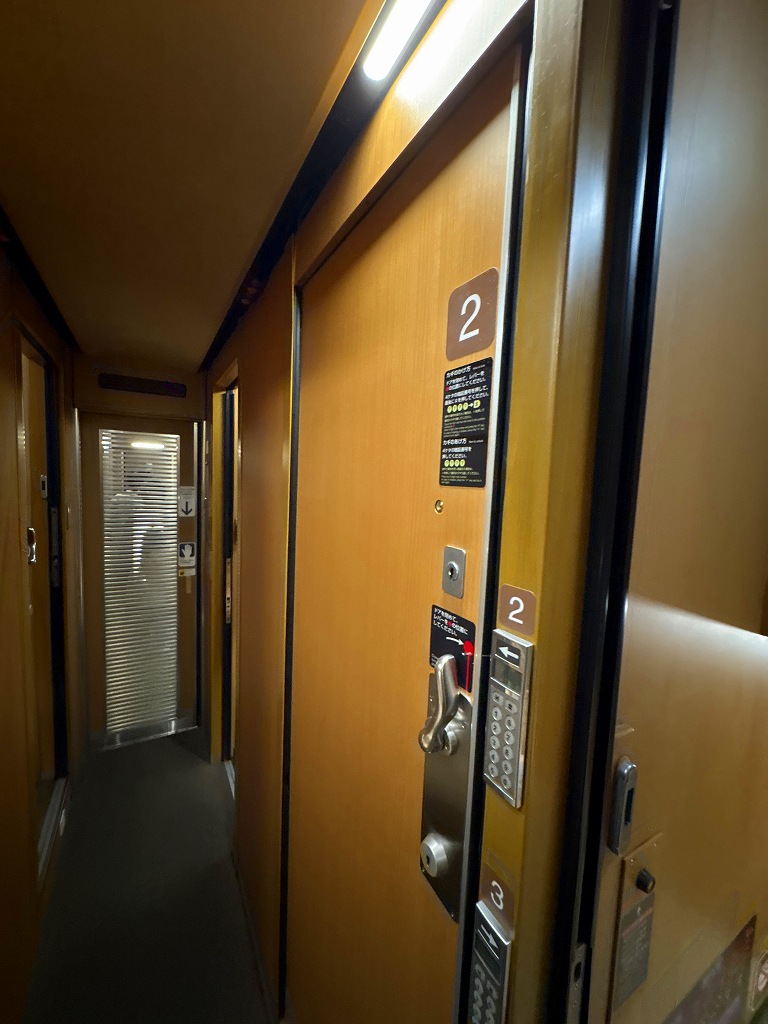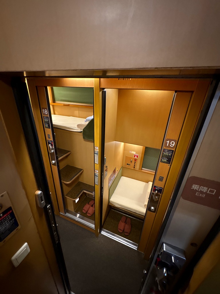 手早く撮影を済ませ、早速乗り込みます。とりあえず自分の車両がどんなものかとウロウロしますが、なにせ通路が狭いので大きなキャリーを引いた人とはすれ違いが大変です。自分の部屋の反対側に自動販売機があったのですが長蛇の列が。よくYOUTUBEで聞く、シャワー券の自販機に並んでいるようです。高松の自宅から来る分には家で風呂に入ればいいのだけれど、観光をして列車で寝るとなるとこれも死活問題なのかもしれません。