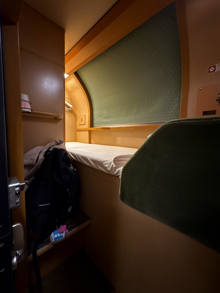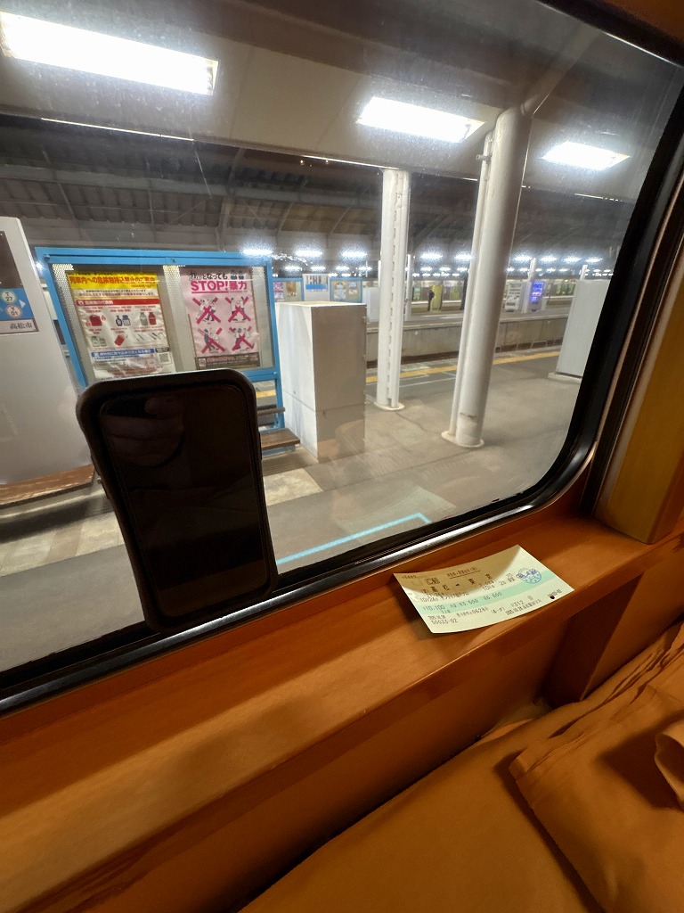私と同じように車内をウロウロしたり、彼女を連れた若者が「ここがソロで云々」とルームツアーをしています。こちらは一杯やろうと早々と部屋に入ります。荷物を入れていると通路を通る車窓さんと目が合います。「切符を拝見します」と検札が済みました。以前サンライズに乗った時に、発車してから検札に来た記憶があって「どのタイミングで来るんだろうか」と気になっていたことが解決です。「ご協力ありがとうございます。それでは、おやすみなさい」となかなか列車のなかで聞かないフレーズにテンションがさらに上がります。