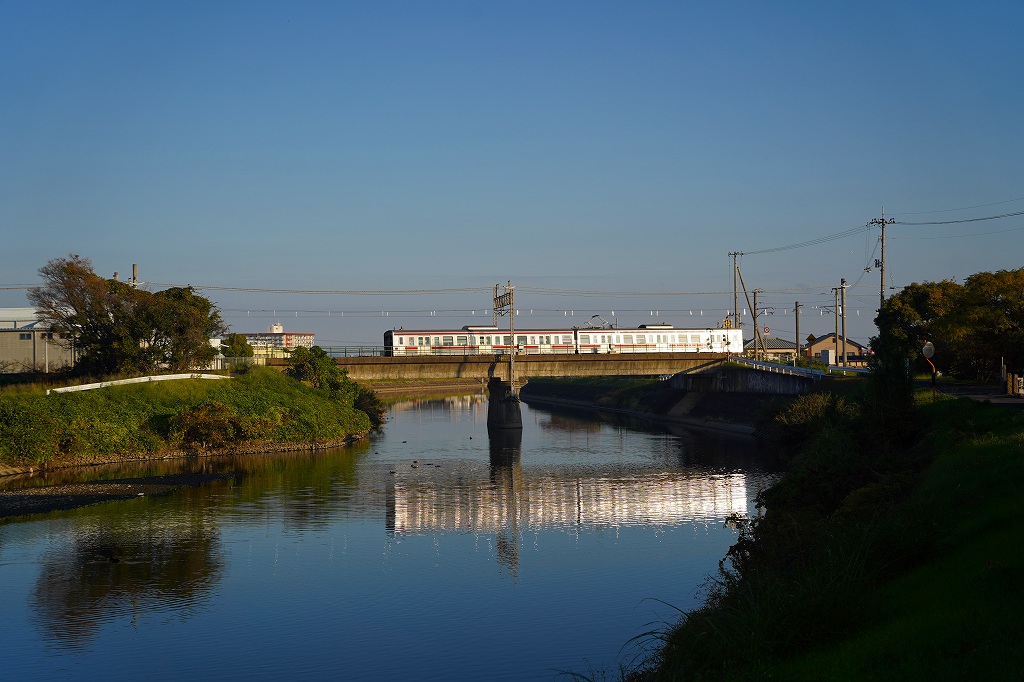 8時前にポイントを目指していると普通れ列車が走ります。朝日を浴びてボディーがギラリと光ります。